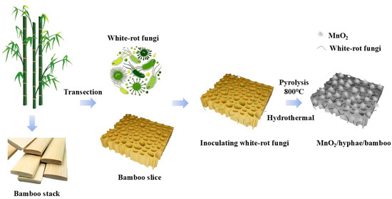 After 2 weeks, the samples were taken out, and the surface hypha and impurities were gently scraped off. They were then dried to a constant weight in a drying oven at 103 ± 2 °C. Subsequently, the bamboo sample eroded by white-rot fungi was placed in a tube furnace under nitrogen protection. From there, it was heated at a rate of 5 °C·min−1 to 500 °C for 1.5 h and then to 800 °C for 2 h for complete pyrolysis. Finally, it was cooled from 5 °C·min−1 to 500 °C and finally to room temperature naturally, yielding a hypha/bamboo-based carbon material.
