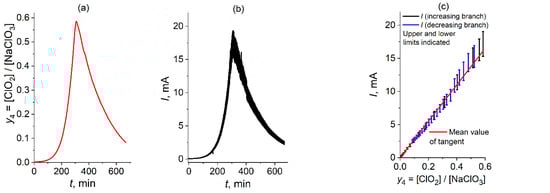 One should note first of all that the points for the increasing and decreasing branches in Figure 5a,b are overlapping in Figure 5c (black and blue points, respectively). Moreover, all these points are located near a straight (red) line passing through the origin. It means that the experimental values of the current and of the ClO2 concentration at any time are proportional between one another, the proportionality constant being the same within the whole time range, including the increasing and decreasing branches in Figure 5a,b.