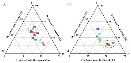 The distribution of three main components in dry-based samples: (a) flue gas atmosphere combined upgrading samples, (b) air atmosphere combined upgrading samples. The dotted circles indicate samples with relatively close ash content, volatile content and FC content.