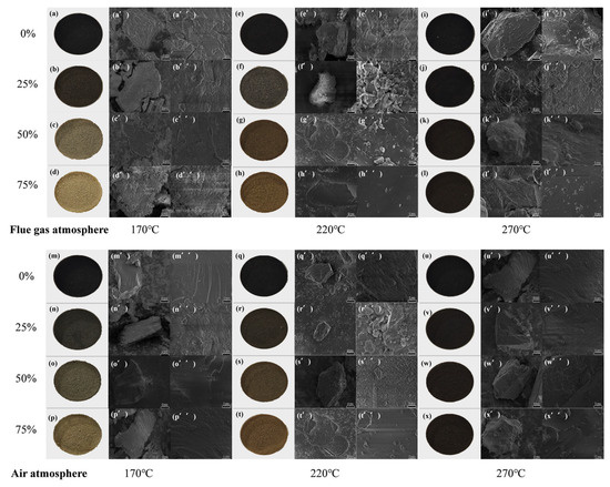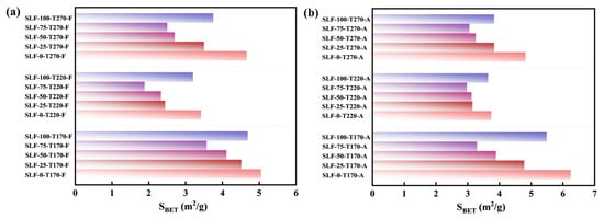 Figure 2 clearly illustrates the effects of reaction temperature, wheat straw blending ratio, and atmosphere on the surface morphology of lignite–wheat straw blended fuels. As shown in Figure 2a–x, under lower pretreatment temperatures, SLF fuels undergo significant color transitions. Increasing the wheat straw blending ratio shifts the fuel color from its original state to brown tones, likely due to moisture removal and tar deposition on the surface. At 270 °C, all samples turn black regardless of blending ratio, indicating biomass carbonization into biochar [24]. Further analysis of Figure 2a′–x′ reveals that reaction temperature dominates surface structural evolution. Figure 2a″,e″ demonstrate that as the temperature increases to 220 °C, lignite particles exhibit smoothed surfaces with emerging cracks and fine particulate matter. This alteration may originate from the dehydration phase, during which the contraction forces acting on the particle surfaces lead to the collapse of certain pore structures. Consequently, both the number of mesopores and the specific surface area are reduced. According to IUPAC classification, coal pores are categorized into macropores, mesopores, and micropores, with the specific surface area (SBET) primarily governed by mesopores and micropores. Figure 3a shows that SLF-0-T220-F exhibits an SBET of 3.43 m2/g, reduced by 1.63 m2/g compared to SLF-0-T170-F (5.06 m2/g), consistent with the correlation between higher SBET and moisture retention in low-rank coals [25]. At 270 °C (Figure 3a), SBET increases to 4.67 m2/g for SLF-0-T270-F, accompanied by intensified surface cracking. BET analysis suggests that thermal shrinkage from moisture evaporation collapses macropores into mesopores and micropores, restructuring the pore hierarchy.