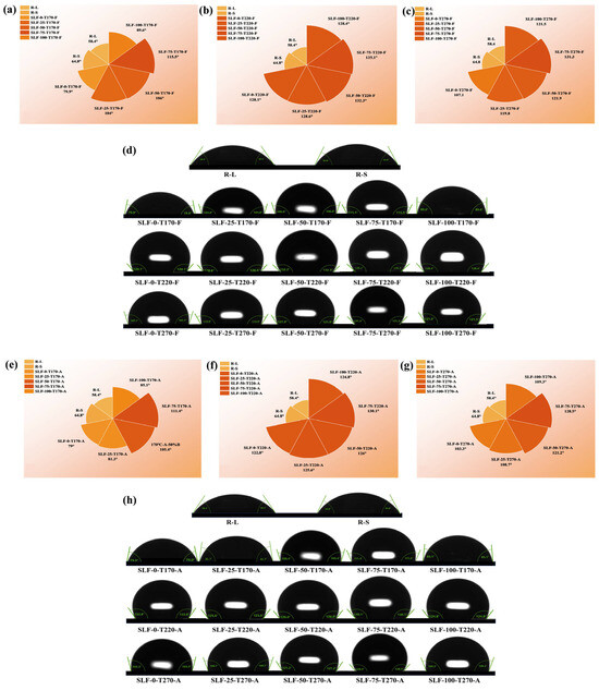 Nightingale diagram of contact angle characteristics; (a–c) contact angle of upgraded fuel under flue gas atmosphere; (e–g) contact angle of upgraded fuel under air atmosphere; (d,h) contact angle of the size of the physical map.