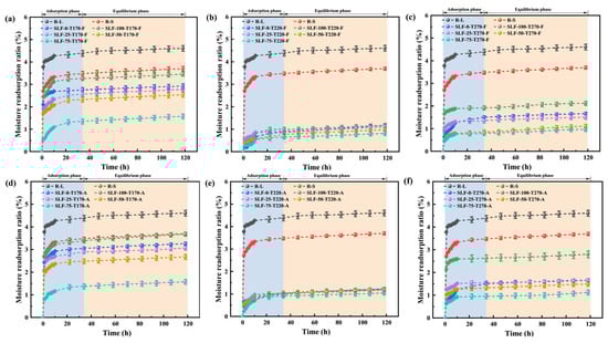 Moisture reabsorption characteristics of upgraded fuels under different conditions at 20 °C, 50% RH: (a–c): Samples with different mixing ratios from 170 °C to 270 °C in flue gas atmosphere; (d–f): Samples with different mixing ratios from 170 °C to 270 °C in air atmosphere.