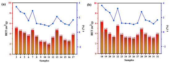 The relationship between ε and BET surface area of different upgraded fuels: (a) flue gas atmosphere; (b) air atmosphere.