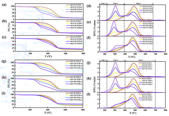According to Figure 7d–f,j–l, it can be seen that the variation in upgrading temperature has no significant impact on the individual combustion of lignite. For SLF blended fuels, as the temperature increases from 170 °C to 220 °C, the characteristic peaks of the second and third stages shift towards lower temperature regions. This suggests that both the ignition temperature and the burnout temperature exhibit a downward trend. This phenomenon occurs because, within the lower temperature range, the volatile matter content in the mixture is higher than that in coal. At 220 °C, the volatile matter in SLF fuel is effectively released, and its easily ignitable tar cracking products adhere to the surface of the mixture, significantly enhancing the combustion reactivity of the blended sample. However, as the upgrading temperature increases to 270 °C, the peaks gradually shift towards higher temperature regions. This can be attributed to the substantial loss of volatile matter from wheat straw, resulting in a reduced yield of tar cracking products that cannot effectively adhere to the surface of SLF fuel. Additionally, the stability of the macromolecular structure in lignite is enhanced under high-temperature upgrading conditions, while the release of volatile matter and the decomposition of oxygen-containing functional groups are also affected [33]. The TG curves in Figure 7a–c,g–i indicate a reduction in the residual mass of the samples, suggesting that the addition of wheat straw promotes the combustion of lignite. These experimental results are corroborated by the combustion characteristic parameters listed in Table 2. Similar thermodynamic phenomena triggered by the presence of biomass have also been revealed in previous studies [6,34].