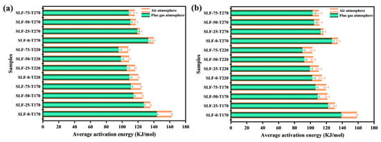 The average value of the activation energy of the combustion process of the mixed fuel under the flue gas atmosphere and the air atmosphere: (a) FWO method; (b) KAS method.