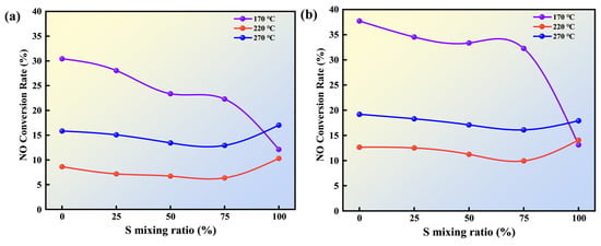 The conversion rate of NO during the combustion process: (a) flue gas atmosphere; (b) air atmosphere.