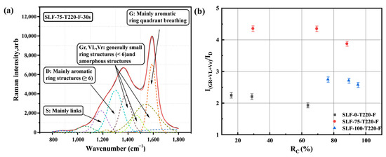 Raman results of sample flue gas pretreatment of oxidized semi-coke; (a) Raman spectrum deconvolution example; (b) Correlation between I (Gr+VL+Vr)/ID values and RC.