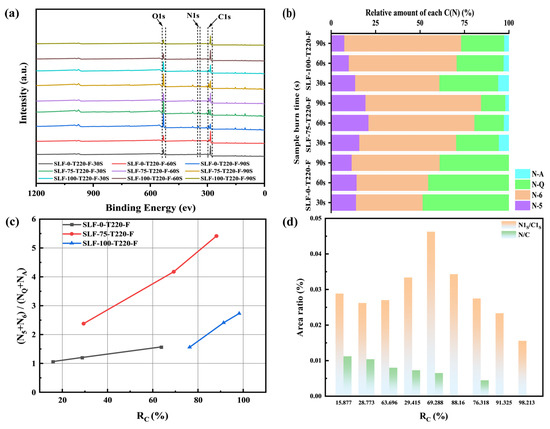 In the study of surface elements in lignite, biomass, and co-upgraded blended fuels, XPS is frequently employed to analyze the differences in the chemical states of surface elements. As shown in Figure 11a, the XPS full spectra of SLF-0-T220-F, SLF-75-T220-F, and SLF-100-T220-F are presented. The characteristic peaks at binding energies of 284 eV and 398 eV correspond to C1s and N1s, respectively. The ratio of N1s/C1s in the XPS data can reflect the relative content of nitrogen and carbon elements on the surface of the coke particles, thereby providing a reference for analyzing the changes in the samples during the reaction process. As shown in Figure 11d, the variations in N1s/C1s and N/C ratios are presented. For SLF-75-T220-F, the N1s/C1s ratio is consistently higher than that of SLF-0-T220-F and SLF-100-T220-F under any degree of combustion. This phenomenon may be attributed to the transformation of amino groups into aromatic nitrogen compounds or the formation of stable C-N bonds with carbon atoms. These reactions enable nitrogen atoms to exist in a more stable chemical form, leading to the enrichment of nitrogen on the particle surface. The surface of the upgraded blended fuel is coated with a substantial number of tar pyrolysis products (small polycyclic aromatic hydrocarbons). These small polycyclic aromatic hydrocarbons react with O2, wherein the aromatic ring structures capture oxygen molecules via π-π interactions, thereby forming peroxy radicals (ROO•). Subsequently, peroxy radicals are transformed into more stable peroxides or other radical intermediates through hydrogen atom transfer or addition reactions. These intermediates further decompose or react with other radicals to generate a series of oxygen-containing products while releasing additional radicals that propagate the reaction chain [43,44]. These chain reactions consume oxygen, reducing the opportunities for nitrogen elements within the fuel to come into contact with oxygen, thereby decreasing the probability of NO formation.