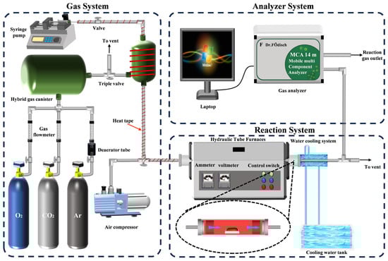Lignite (R-L) from Inner Mongolia Autonomous Region, China, and wheat straw (R-S) from Heilongjiang Province, China, were used as raw materials. Prior to experiments, the lignite and wheat straw samples were pulverized and sieved to achieve a uniform particle size distribution (90–125 μm), and blended fuels with wheat straw mass ratios of 0%, 25%, 50%, 75%, and 100% were prepared. The low-temperature co-upgrading pretreatment was conducted using a fixed-bed reactor system (Figure 12), comprising a gas distribution system, reactor, and flue gas analysis subsystem, though only the first two subsystems were utilized in this study. For each experiment, 0.4 ± 0.003 g of blended fuel was precisely loaded into the reactor. A reactive gas flow of 2 L/min was maintained in a left-to-right direction through the sample bed, significantly enhancing gas–solid contact efficiency while suppressing secondary reactions caused by particle stacking, thereby minimizing experimental interference [48]. Upon entering the reaction zone, lignite particles rapidly underwent heat and mass exchange with the hot gas stream: surface moisture evaporation absorbed latent heat, lowering particle temperature, which subsequently promoted the condensation of pyrolysis-derived tar cracking products from wheat straw onto the cooled lignite surfaces.