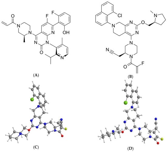 Chemical structure of drugs, Sotorasib (A,C) and Adagrasib (B,D).