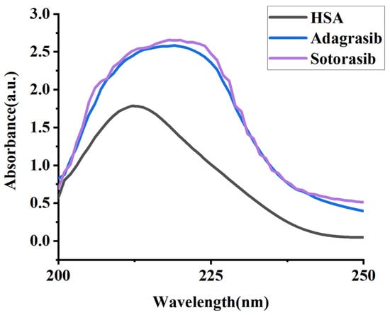 UV absorption peak shifts of HSA upon binding to Sotorasib and Adagrasib at 298.15 K (starting at 210).