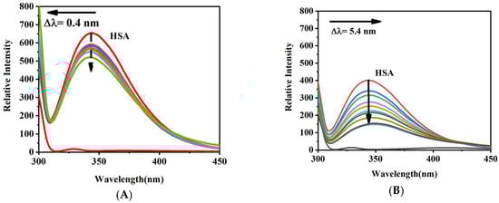 Changes in the fluorescence spectra of HSA (2 × 10−6 M) upon the addition of drugs (0–33 × 10−6 Μ) in aqueous phosphate-buffer solution at 298.15 K. λex = 295 nm. (A) Sotorasib; (B) Adagrasib.