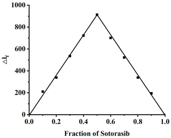 Job’s plot for the complexation of HSA with Sotorasib at 298.15 K in aqueous phosphate-buffer solution ([HSA] + [Sotorasib] = 2.0 × 10−6 M), produced with data taken from fluorescence spectra (λex = 295 nm).