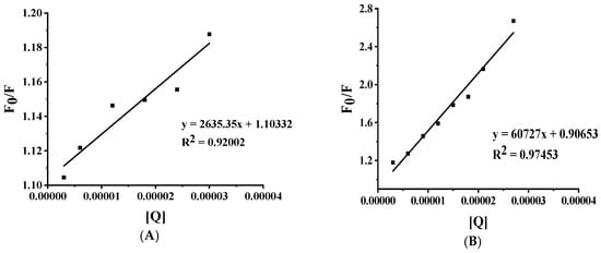 where F0 and F represent fluorescence intensities in the absence and presence of a quencher, respectively; KSV denotes the Stern-Volmer quenching constant; [Q] is the quencher concentration; Kq represents the bimolecular quenching constant; and τ0 indicates the fluorescence lifetime (6.3 × 10−9 s) [27], a characteristic parameter of the fluorophore.