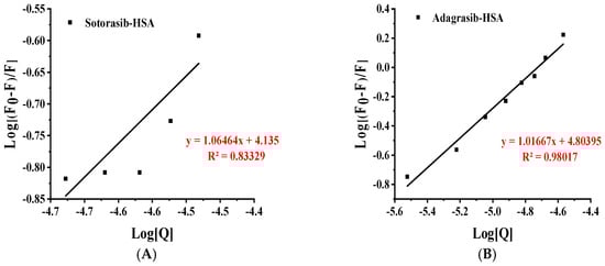 Double logarithmic plot of log(F0 − F)/F against log[Q] for the fluorescence quenching data shown in Figure 3, (A) Sotorasib; (B) Adagrasib.