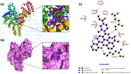 The conformation of (a) the Sotorasib–HSA complex with the lowest energy obtained by molecular docking. HSA is represented by a band structure, and Sotorasib is represented by a stick model. (b) Two-dimensional visualization of the surface model conformation of the Sotorasib–HSA complex. (c) A LigPlot+ diagram of the interaction between Sotorasib (purple) atoms and the amino acid residues of HSA at site I.
