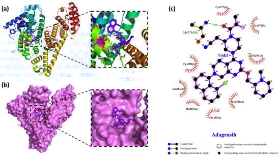 The conformation of (a) the Adagrasib–HSA complex with the lowest energy obtained by molecular docking. HSA is represented by a band structure, and Adagrasib is represented by a stick model. (b) Two-dimensional visualization of the surface model conformation of the Adagrasib–HSA complex. (c) A LigPlot+ diagram of the interaction between Adagrasib (purple) atoms and the amino acid residues of HSA at site I.