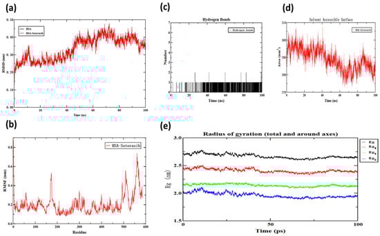 HSA-Sotorasib molecular dynamics simulation images. (a) The plots of RMSD; (b) the plots of RMSF of the WEL-HSA complex and free HSA; (c) the number of hydrogen bonds between WEL and HSA during MD simulation; (d) SASA; (e) Rg.