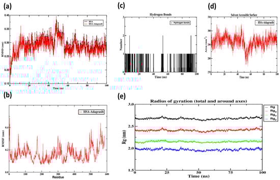 HSA-Adagrasib molecular dynamics simulation images. (a) The plots of RMSD; (b) the plots of RMSF of the WEL-HSA complex and free HSA; (c) the number of hydrogen bonds between WEL and HSA during MD simulation; (d) SASA; (e) Rg.