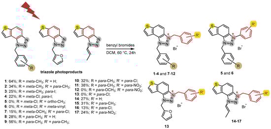 2.1. Photochemically Assisted Synthesis of Charged Thienobenzo-1,2,3-Triazoles 1–17