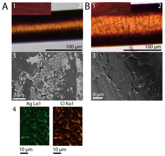 Investigation of particles assigned to dyeing species on the hair surface using SEM revealed an irregular deposition of precipitate on the strand that was treated with 10% HCl (Figure 1A(3)). The dispersion of the grayish solid did not align with the evenness of the dye result. Results from EDX color mapping for chemical characterization of the hair surface showed a high spatial proximity of Ag and Cl promoting the assumption of AgCl deposition (Figure 1A(4)). In comparison, the hair strand that was adjusted to pH 3 using CA did not show a grayish precipitate on the surface in SEM (Figure 1B(3)), yet the strand exhibited a bright red dye result. In addition, SEM images affirmed the tight fit of the cuticle layers, although smaller fragments of cuticular cells were depicted (Figure 1A(3)).