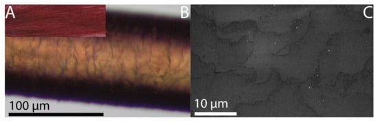 SEM images of hair fibers were conducted on the field emission scanning electron microscope Zeiss LEO Gemini 1550 equipped with an Inlens detector. EDX was conducted using a Silicon-Drift-Detector (SDD) Ultim Max 100 (Carl Zeiss Microscopy Deutschland GmbH, Oberkochen, Germany).