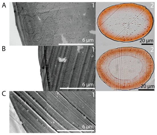 Investigation of dyeing species inside the hair cortex using TEM of microtome cuts from strands treated first with 1% RE suspension, then acidified with 10% HCl and 1% AgNO3, showed small, roughly spherical particles inside the hair cuticula and cortex (Figure 3A(1)).