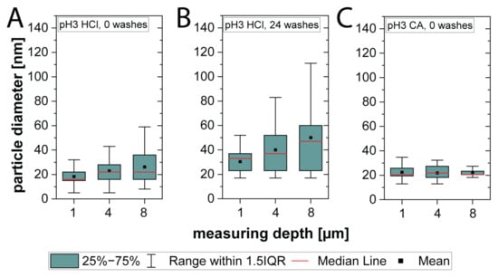 In an unwashed hair strand treated with a 1% RE suspension at pH 3 and acidified with 10% HCl, close to the surface (1 µm penetration depth), the middle 50% (blue box) of particle diameters ranged between approx. 15 and 20 nm (Figure 4A), with an average particle diameter of 18.5 ± 6.6 nm. The median value (red line) indicates that half of the particles were even smaller than 16.2 nm. At 4 µm penetration depth, the average particle size increased to 23.0 ± 8.9 nm and further to 26.3 ± 13.7 nm at 8 µm depth. At penetration depths of 4 and 8 µm, the particle size distribution broadened, indicating a wider spectrum of particle diameters. This dispersion was further substantiated by a corresponding increase in the interquartile range (IQR), reflecting enhanced variability. The middle 50% of particle diameters ranged between 16 and 28 nm at 4 µm penetration depth and between 16 and 36 nm at 8 µm. Yet, the median value for those size diameters did not increase (21.6 nm at 4 µm and 22.3 nm at 8 µm), indicating that at 8 µm, more particles with bigger diameters were observed.