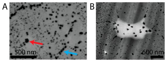 (A) Excerpt of TEM image of strand treated with 1% RE at pH 3, adjusted with HCl (10%), and subsequent treatment with 1% AgNO3. Blue arrow marks approximated NPs; red arrow marks agglomerated or merged NPs. (B) Excerpt of TEM image of strand treated with 1% RE at pH 3 adjusted with 10% HCl and subsequent treatment with 1% AgNO3, and which was washed 24 times. Incidental cavity in hair matrix holds larger particles than denser surrounding hair matrix.