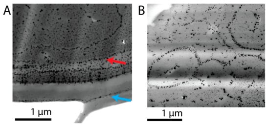 TEM images of strand treated with 1% RE at pH 3 adjusted with 10% HCl and subsequent treatment with 1% AgNO3 after zero washes. (A) Particles show a lamellar distribution along the cuticular layers (blue and red arrow) and accumulate within the hair cortex. (B) Particles accumulate inside the hair cortex in the cortex–cortex CMC that surrounds the cortical cells.