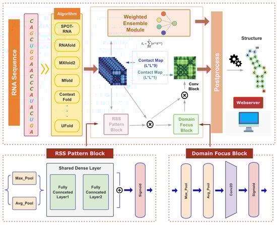Here, we proposed an end-to-end RSS prediction algorithm, TrioFold, based on ensemble deep learning and convolutional attention mechanism [23] (Figure 1). In detail, six representative ML models (MXfold2 [24], UFold [10], SPOT-RNA [25], EternaFold [26], CONTRAfold [27], and ContextFold [28]) and three thermodynamic-based models (Mfold [29], LinearFold [30], and RNAfold) were used as base learners to explore the impacts of different ensemble methods on RSS prediction accuracy and generalizability. Firstly, two different ensemble models were evaluated in the TestSetA and TS0 datasets. In the TestSetA and TS0 datasets, the F1 score of the TrioFold was 3–5% higher than that of the second-best model, and in other datasets, TrioFold showed strong prediction robustness. Furthermore, TrioFold achieved the best performance on three datasets of unseen families, suggesting its enhanced generalizability for new RNA sequences and families. Moreover, we implemented TrioFold and those base learner methods in a one-stop user-friendly webserver to enable convenient usage for biologists without any programming requirement. The webserver provides RSS prediction and analysis functions, and it can be freely accessed at http://triofold.aiddlab.com/ (accessed on 16 August 2025).