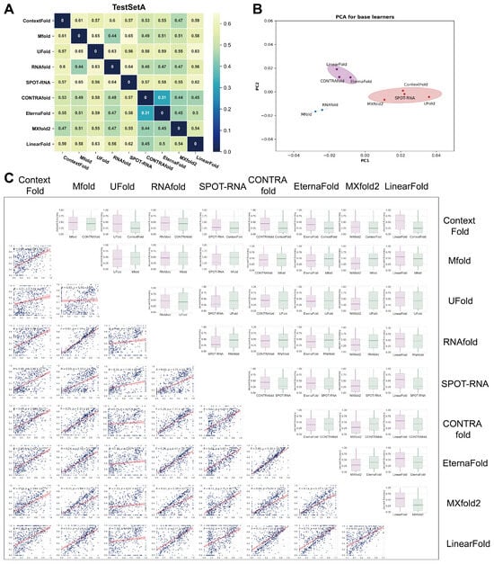 Significant differences in the output structures between different algorithms. Base learners’ concordance and prediction performance of ensemble models using different base learner combinations on TestSetA. (A) The Jaccard distance of RSS predicted by each base learner. The larger the Jaccard distance, the greater the difference in the predicted SS of the two base learners. (B) PCA results for base learners with ellipses. (C) The box plot illustrates the difference in accuracy of Jaccard distance between the two algorithms, while the scatter plot shows the correlation of Jaccard distance for all samples between algorithm pairs.