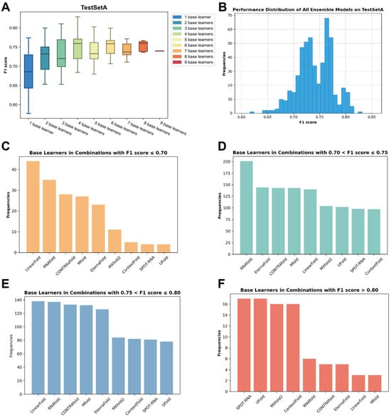 Furthermore, in our observation of combinations exhibiting different F1 scores, we noted variations in the frequency of appearance of base learners (Table S1). We found that combinations with lower F1 scores demonstrate a higher occurrence of base learners such as RNAfold and Mfold. Conversely, in combinations yielding higher F1 scores, algorithms like UFold and ContextFold exhibit a higher frequency (Figure 3C–F). This signifies that the performance of base learners is a pivotal determinant of the overall performance of the ensemble model.