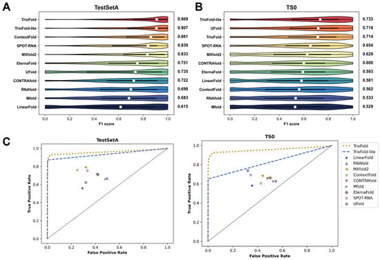 Performance comparison between TrioFold and existing methods. Distribution of F1 scores for different algorithms on TestSetA (A) and TS0 (B), respectively. (C) ROC curves on TestSetA and TS0 by various methods.