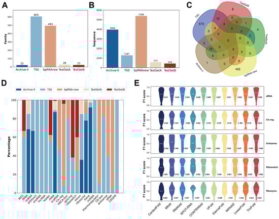 RNA SS prediction performance among different RNA clans. (A) Bar chart shows the distribution of Rfam families in certain datasets. (B) Bar chart shows the sequence numbers in certain datasets. (C) Venn chart shows the overlapping of different Rfam families in different datasets. (D) Histogram plot shows the distribution of RNA types on the TestSetA + TS0 + bpRNA-new + Archive-II. (E) Violin plot shows the performance on top-5 RNA CLANs on bpRNA-new.
