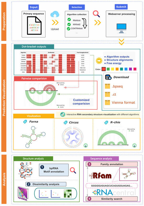 - Tsybulskyi, V.; Semenchenko, E.; Meyer, I.M. e-RNA: A collection of web-servers for the prediction and visualisation of RNA secondary structure and their functional features. Nucleic Acids Res. 2023, 51, W160–W167. [Google Scholar] [CrossRef]