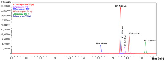 The retention time of bromazepam, clonazepam-d4, clonazepam, alprazolam, flunitrazepam and diazepam are 6.17, 7.52, 7.55, 7.81, 8.12 and 9.24 min, respectively.