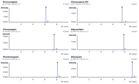 Various LC-MS/MS methods have been developed for the detection of benzodiazepines in biological matrices such as plasma [6,7,8,9,10,11], urine [12,13,14,15,16], combined plasma and urine [1,17], oral fluids [18,19], and hair [13,15,16,20,21,22]. Although gas chromatography–mass spectrometry (GC-MS) has also been used, it typically requires derivatization of benzodiazepines before analysis [23,24,25,26,27]. In contrast, LC-MS/MS eliminates this additional step, making it more practical and efficient. High-performance liquid chromatography with UV detection (HPLC-UV) has also been employed for plasma analysis of certain benzodiazepines [28,29,30], but no validated LC-MS/MS method exists specifically for the simultaneous quantification of alprazolam, bromazepam, clonazepam, diazepam, and flunitrazepam in human urine.