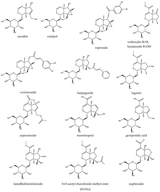 Structurally, iridoids typically occur as glycosides (iridoid glycosides) and less commonly as aglycone forms, secoiridoids (resulting from the enzymatic cleavage of the 7,8-cyclopentane bond), and bisiridoids dimers formed through the coupling of two iridoid or iridoid-secoiridoid units. The structural versatility of the cyclopenta[c]pyran core enables diverse functional modifications, resulting in compounds with distinct bioactivities [16]. The present review is focused on elucidating the mechanistic aspects of iridoid glycosides found in species native to Bulgaria, traditionally used for their hepatoprotective, neuroprotective, antidiabetic, and general anti-inflammatory properties. Among these, aucubin and catalpol, sharing high structural resemblance (differing by the presence of an epoxide group in catalpol’s structure), are the most widely distributed and well-studied iridoid glycosides, occurring in multiple native to Bulgaria species such as Veronica officinalis, Plantago spp., Verbena officinalis, Verbascum phlomoides, and Gratiola officinalis [17,18,19]. Furthermore, we have explored the pharmacodynamic profiles of several iridoid metabolites with a more species-specific distribution, such as verbenalin and hastatoside (Verbena officinalis), harpagoside (Scrophularia nodosa, Gratiola officinalis), lamalbid, asperuloside, and monotropein (Galium spp.), shanzhiside, and its 8-acetyl methylester (8-OaS) (Lamium album) (Figure 1).