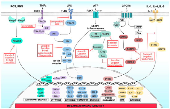 Many iridoid glycosides have been recognized as potent modulators of this signaling pathway, producing anti-inflammatory, antioxidant, and cytoprotective effects, mostly by hindering the process of NF-κB nuclear translocation.