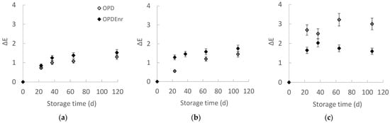 Evolution of color with storage time at (a) 20, (b) 30 and (c) 40 °C for products OPD and OPDEnr (mean value of three ± standard deviation).
