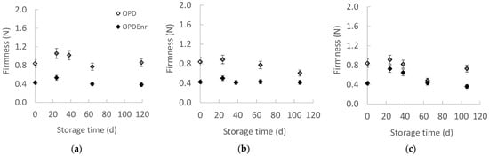 Figure 2a–c presents the evolution of the firmness for the developed olive paste dip products OPD and OPDEnr with the storage time at all storage temperatures. Statistically significant differences were observed between the samples at all three temperatures (p < 0.05). It appears that OPDEnr product was less firm compared to the OPD one. No specific trend was observed over time; both OPDEnr and OPDEnr remained almost stable throughout the experiments (p > 0.05).