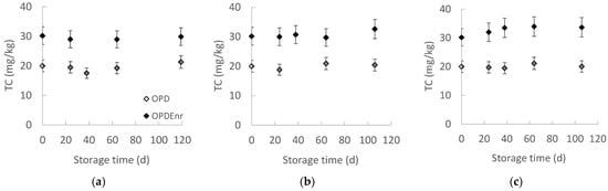 Evolution of total carotenoids with storage time at (a) 20, (b) 30 and (c) 40 °C for products OPD and OPDEnr (mean value of three ± standard deviation).