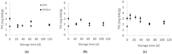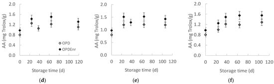 Total phenolic content (TPC) (a–c) and antioxidant activity (AA) (d–f) of products, OPD and OPDEnr, with storage time at (a,d) 20, (b,e) 30 and (c,f) 40 °C (mean value of three ± standard deviation).