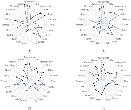 The sensorial quality of the products, OPD and OPDEnr, can be described in terms of appearance (oil detection and color browning), odor, texture (crispiness, firmness, and gumminess), taste (overall, sweet taste, salty taste, and other), flavor, aftertaste, and total sensory quality. In Figure 6, average scores (scale 1–9) for the characteristics (axes 1–23) of OPDEnr and OPDEnr products are demonstrated.