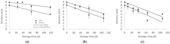 By fitting the zero-order kinetic model to the experimental data, it was possible to determine the constant rates of sensory deterioration at each storage temperature (ks). The results of the fitting for the OPD and OPDEnr samples are presented in Table 3.