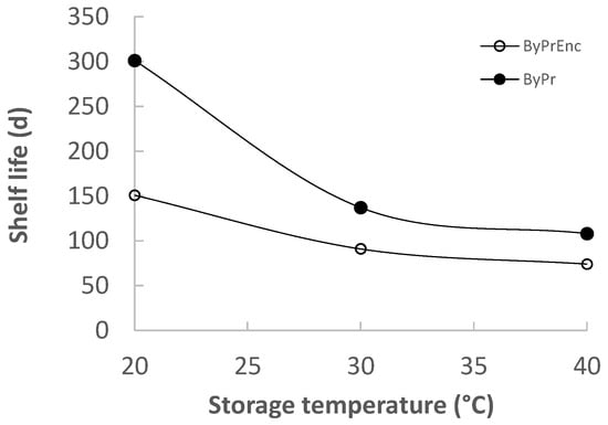 Shelf life—based on sensory deterioration (overall sensory acceptance)—of products OPD and OPDEnr at 20, 30, and 40 °C.