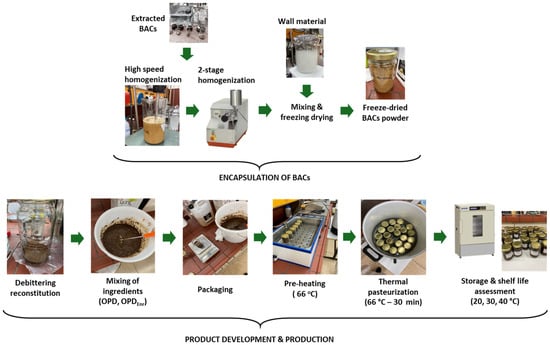 In this study, two innovative olive paste dip prototypes were developed: one enriched with BACs (carotenoids and phenolic components) to enhance product antioxidant properties and increase product stability (OPDEnr) and one without enrichment with BACs acting as the control sample (OPD). Dried tomato and olive pomace was incorporated into both olive paste dip prototypes (OPD and OPDEnr) to enhance the eco-friendliness of the innovative products via the valorization of food industry by-products. Other ingredients for both products were pomace oil, pepper, olive slices, dry olive by-product, water, vinegar, glycerol, dry tomato pomace, and capers (Table 4). To decrease the bitter flavor (due to oleuropein glucoside, the main phenolic compound of olive oil products/by-products) and increase the sensory quality and acceptability of the product, the debittering of the dry olive pomace was performed (Figure 9) [50,52,53]. The olive paste dip prototypes were packaged in glass jars and thermally pasteurized (66 °C, 30 min).