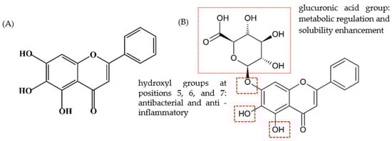 Among the best-studied and most promising plant flavonoids for therapeutic applications is baicalin (chemical formula: C21H18O11), which is derived primarily from the dried roots of Scutellaria baicalensis (Chinese skullcap) [4], a perennial flowering plant of the Lamiaceae family native to wide regions of Southeast Asia. Trace amounts of baicalin have also been detected in the roots of related species of the same genus, such as Scutellaria integrifolia and Scutellaria racemosa, but S. baicalensis remains the core natural source for industrial extraction [4]. Baicalin is isolated as a yellow crystalline solid with a molecular weight of 446.4 g/mol and a melting point of 202–205 °C [5]. It is almost insoluble in water but readily soluble in alkaline solutions, with pKa1 and pKa2 values of 7.6 and 10.1 in 0.1 M NaCl at 25 °C [5]. The core structure of baicalin is baicalein (chemical formula:C15H10O5), a phenol-containing aglycone with a 7-position hydroxyl group linked to glucuronic acid via a glycosidic bond, which enhances its solubility in polar protic solvents (Figure 1) [6]. After administration, free baicalin accumulates at relatively high levels in the kidneys, while relatively low concentrations are initially detected in the heart, liver, and spleen [7]. In contrast, liposome-encapsulated baicalin concentrations progressively increase in the heart, liver, spleen, lungs, and brain, concomitant with decreasing concentrations of free baicalin in the kidneys [8]. Following oral ingestion, baicalin is hydrolyzed by the intestinal flora to form baicalein, which is then absorbed. Subsequently, baicalein is converted back to baicalin in the liver, resulting in biphasic absorption peaks [7,8]. After intravenous administration, baicalin exhibits a typical pharmacokinetic curve; however, the free form is cleared rapidly, with a short half-life [7]. Both the parent drug and its conjugated forms (such as glucuronides and sulfates) can be detected in the serum [9], while baicalin metabolism is dominated by glucuronidation. Due to first-pass metabolism, glucuronic acid conjugates predominate in plasma [9]. The ileum and jejunum also participate in the conjugate metabolism of baicalin [9]. The glucuronide and sulfate conjugates generated through metabolism are primarily excreted into the small intestine via the biliary route, with renal excretion serving as a secondary pathway [9].