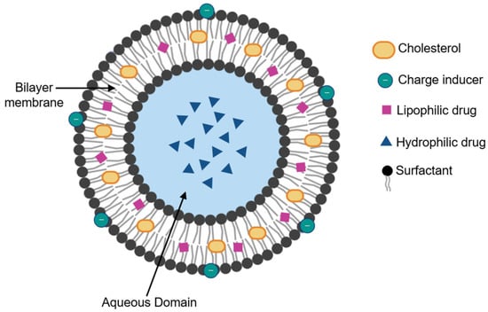 Niosomes are generally composed of cholesterol, surfactants, charge inducers, and a hydrating medium, which, when mixed in the right proportion, provide stability to the vesicle, forming a bilayer structure. This bilayer gives niosomes a particular geometry with two areas: a central one giving an aqueous domain and another lipid domain. Niosomes can encapsulate both hydrophilic and hydrophobic drugs. Hydrophilic drugs are encapsulated in the central aqueous domain, while hydrophobic species are encapsulated by partitioning, as shown in Figure 1 [2,4].
